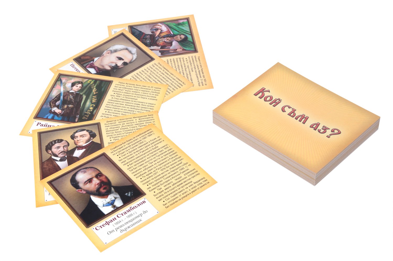 Целият комплект съдържа 51 карти. Върху всяка от тях има изображение на личността, години на управление на владетелите или раждането и смъртта на всички останали. Отстрани е поместена кратка информация с най-важните събития от живота на изобразената личност и обяснение с какво този човек е повлиял върху живота на съвременниците си и какъв отпечатък е оставил в историята, за да може да бъде определен като значим за народа ни и днес.