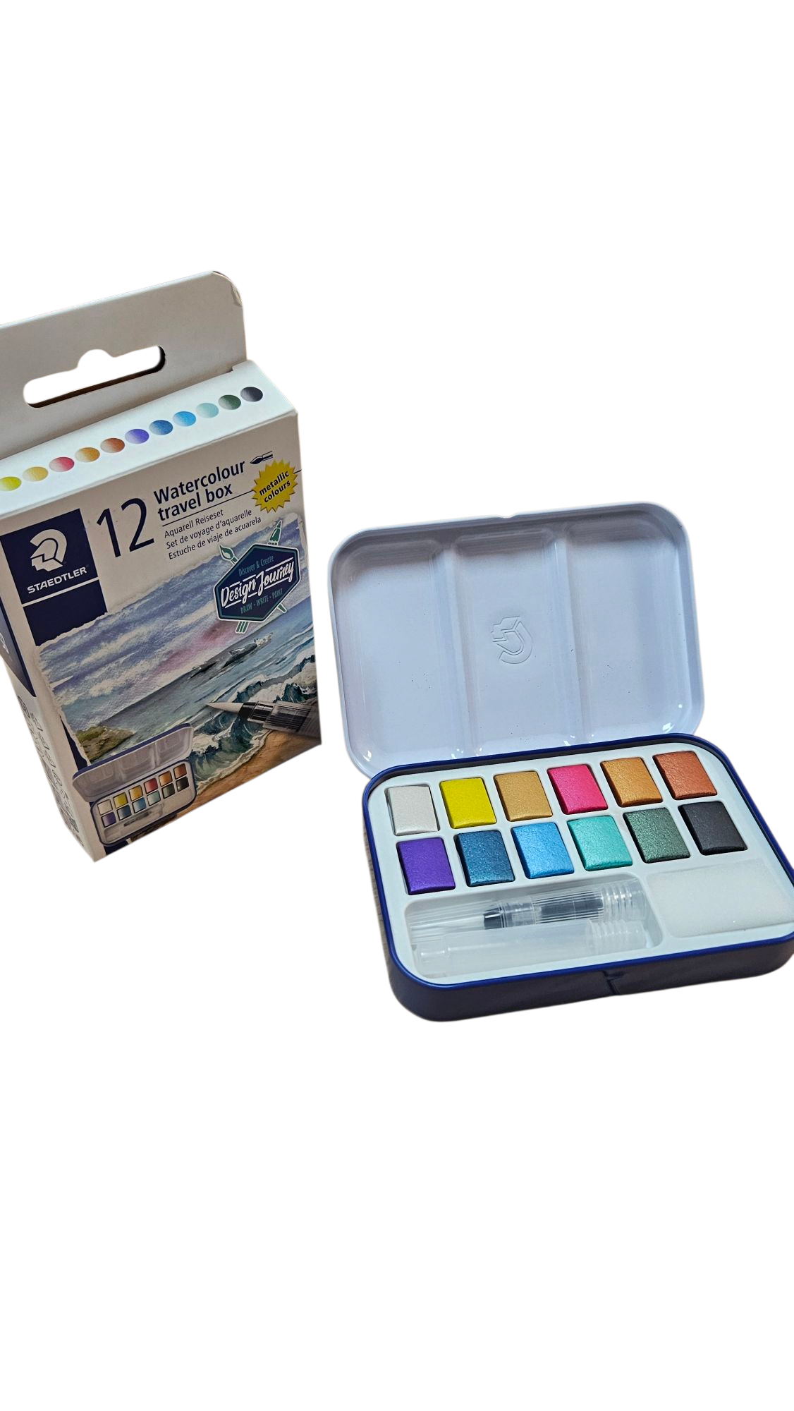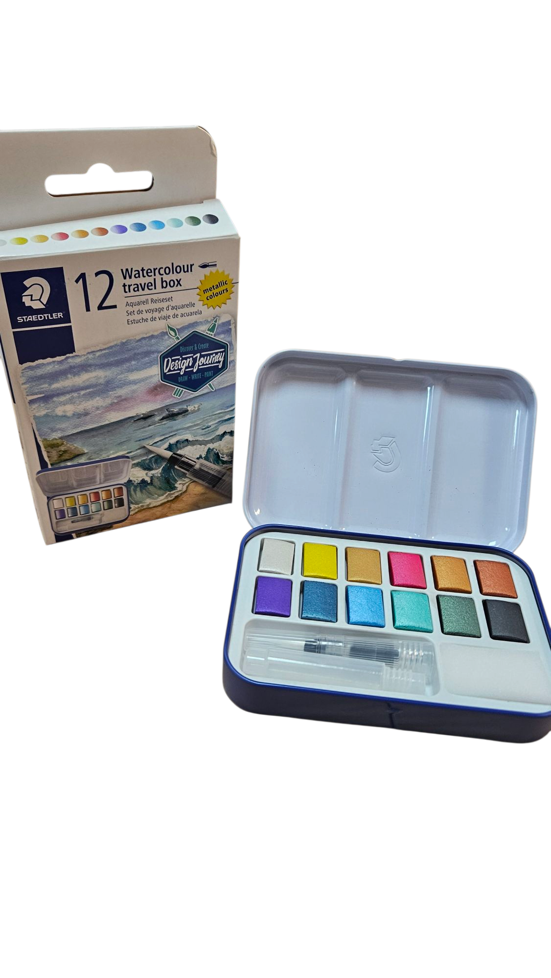 Комплект акварелни бои Staedtler Design Journey, 12 металик цвята, в метална кутия + четка с резервоар