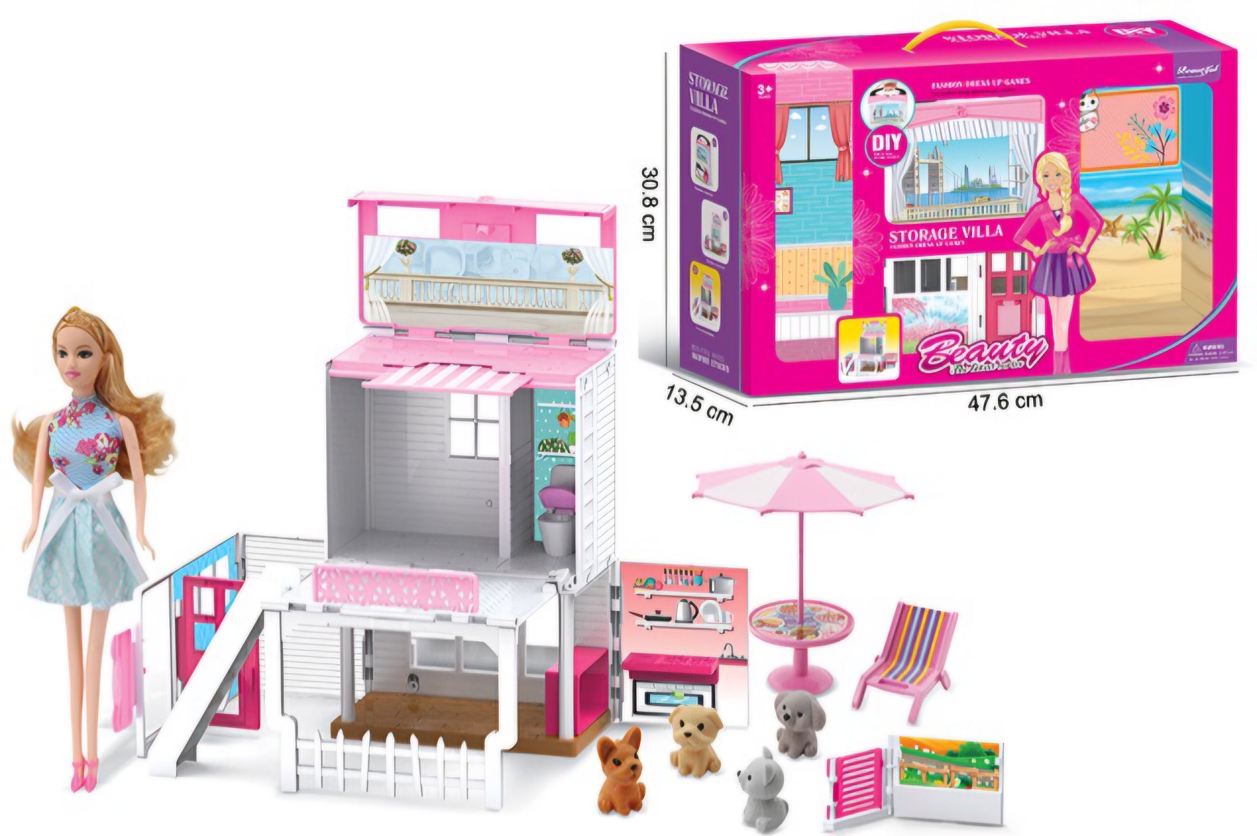 Тази къща за кукли се отличава с модерен дизайн и включва всичко необходимо за креативност на децата включително и 4бр.малки сладки кученца.Децата могат да се забавляват с приятели при готвене в кухнята или с малките домашни любимци .Комплекта включва още шезлонг и чадър.