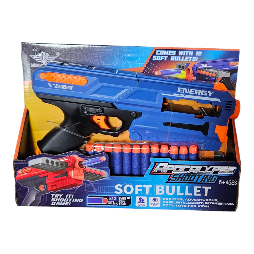 В комплект с 12бр.меки стрели,които могат наведнъж да се раздят в пистолета ,забавата става още по -голяма.