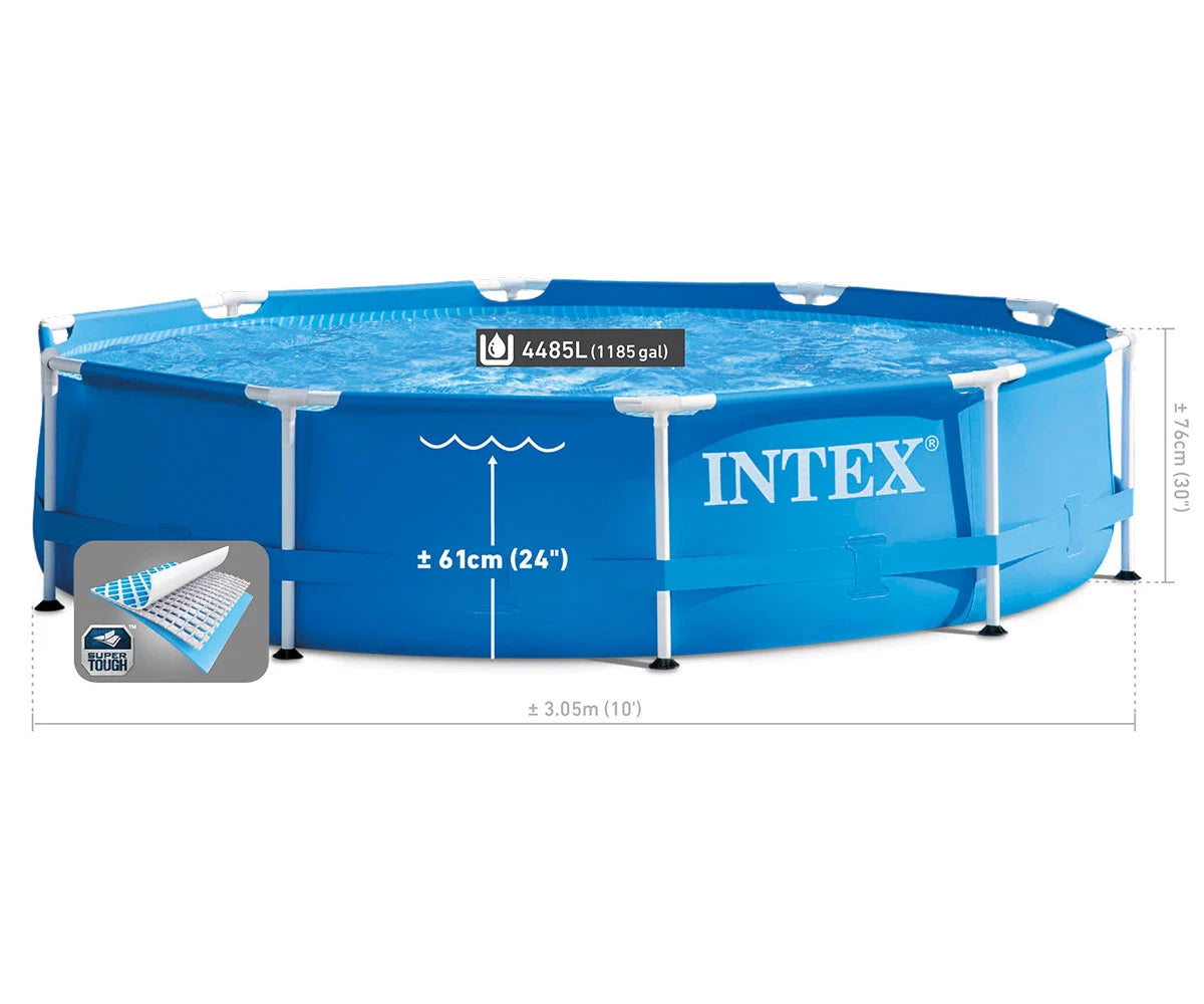 Победете жегата през цялото лято с басейна Intex Metal Frame Pool. Този басейн се поддържа от здрави и издържливи стоманени рамки, които са проектирани да издържат. Новият иновативен дизайн на T-Joint прави монтажа бърз и лесен, за да имате повече време да се насладите на басейна.