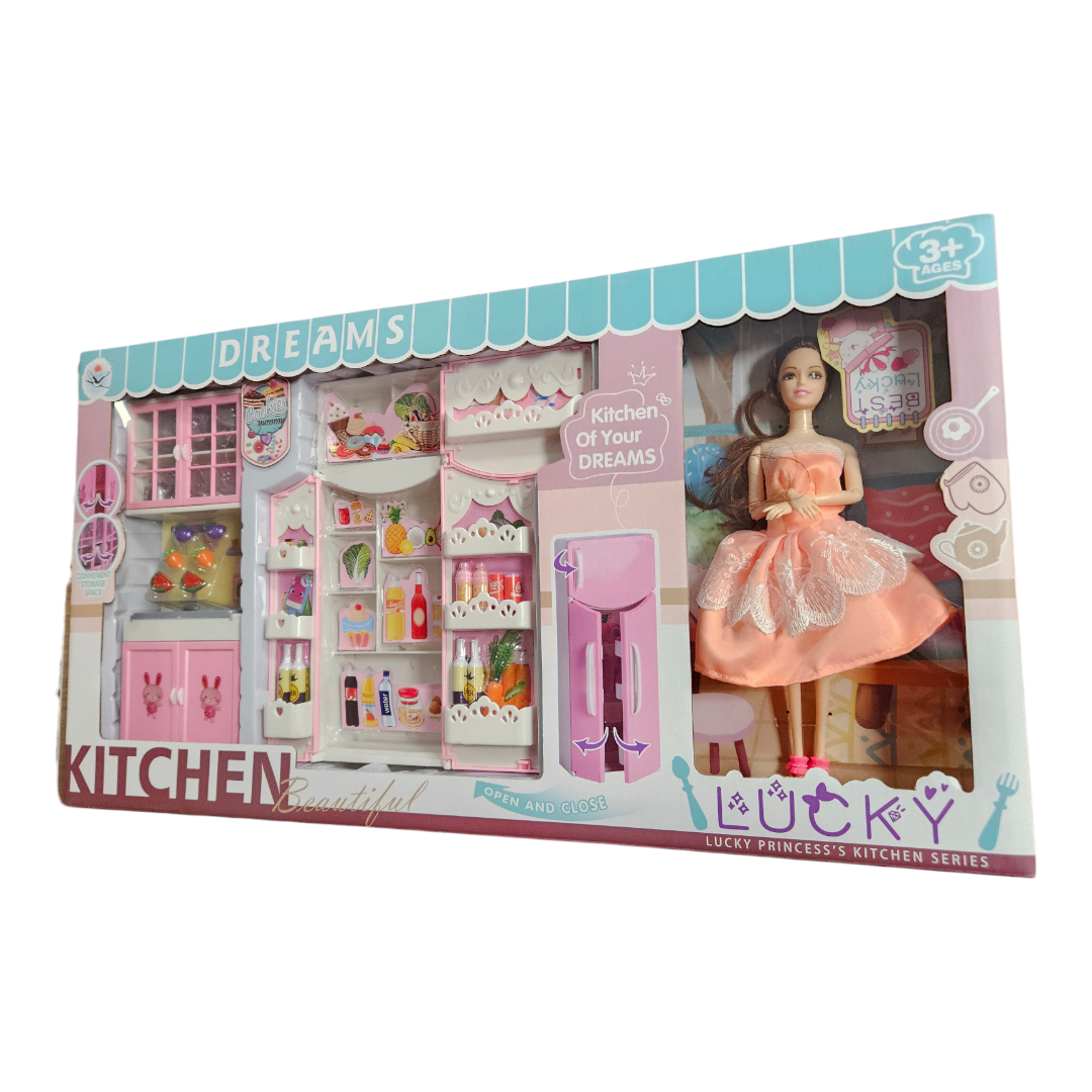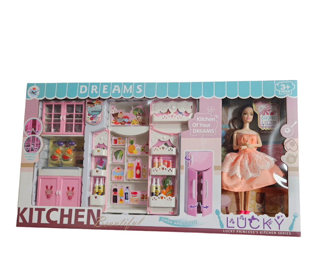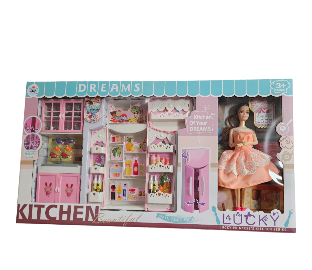 Комплекта включва кухненски уреди,плодове ,посуда и др.